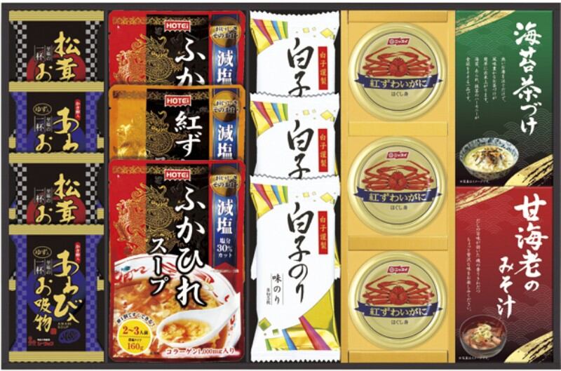 商品内容:ふかひれスープ160g・あわび入お吸い物4g・松茸入りお吸い物4.2g×各2、紅ずわいがにほぐし身55g・白子のり(8切5枚)×各3、紅ずわいがにスープ160g・甘海老みそ汁(7.5g×2)・丸美屋のり茶漬け(6g×4)×各1