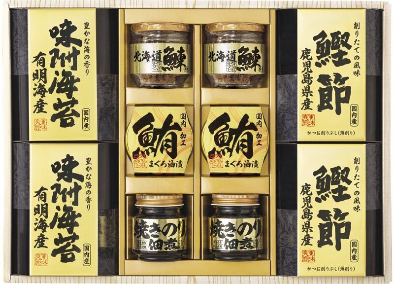 商品内容:北海道産鰊フレーク50g・焼きのり佃煮85g・鹿児島県産鰹節(2g×3)・有明海産味附海苔(8切10枚)・まぐろ油漬け70g×各2