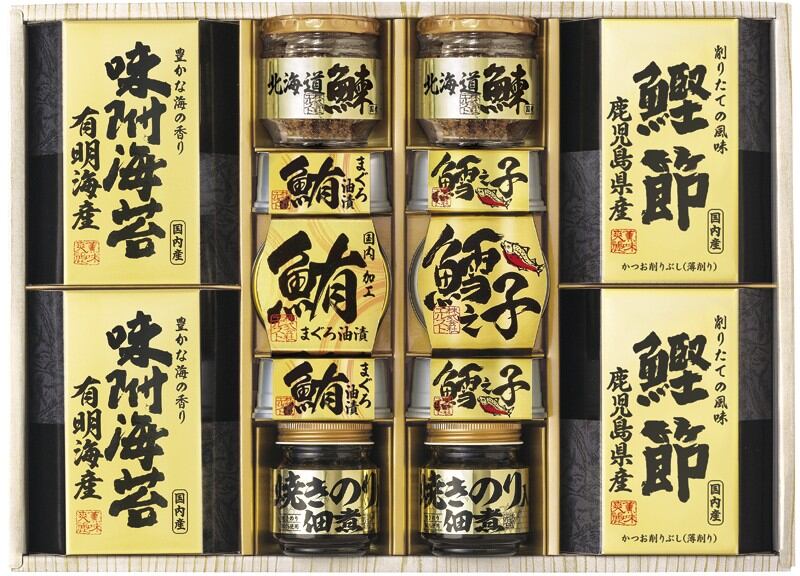 商品内容:北海道産鰊フレーク50g・焼きのり佃煮85g・鹿児島県産鰹節(2g×3)・有明海産味附海苔(8切10枚)×各2、まぐろ油漬け70g・鱈之子味付け70g×各3