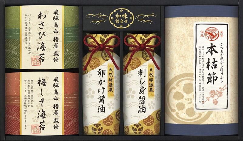 商品内容:飛騨高山椿屋監修(わさび海苔・梅しそ海苔)(8切6枚)・天然醸造蔵仕込み(卵かけ醤油・刺し身醤油)200ml×各1、本枯れ鰹節2g×3