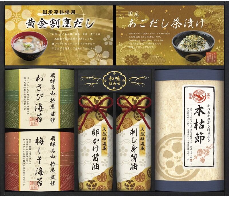 商品内容:飛騨高山椿屋監修(わさび海苔・梅しそ海苔)(8切6枚)・天然醸造蔵仕込み(卵かけ醤油・刺し身醤油)200ml×各1、本枯れ鰹節2g×4、黄金割烹だしパック8g・国産あごだし茶漬け5g×各2