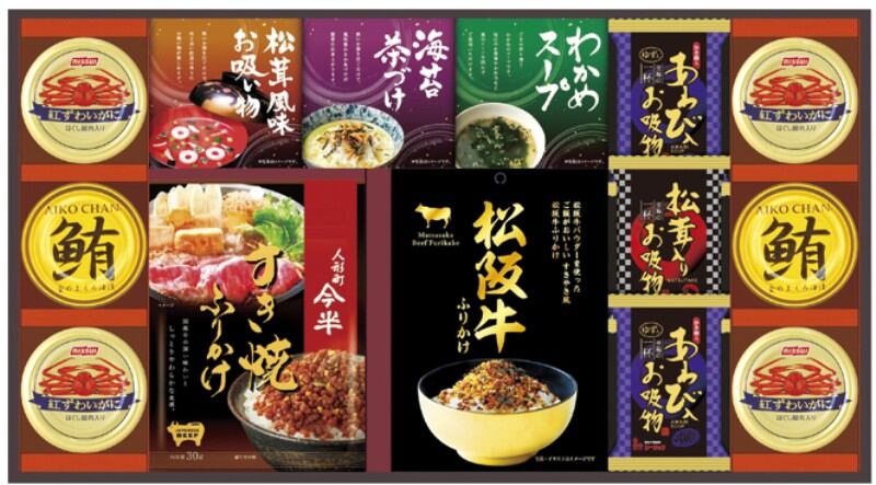 商品内容:人形町今半すき焼きふりかけ30g・松阪牛ふりかけ30g・丸美屋のり茶漬け(6g×2)・永谷園松茸風味お吸い物(2.3g×2)・わかめスープ(3.5g×3)・松茸入りお吸い物4.2g×各1、紅ずわいがにほぐし身55g×4、鮪油漬フレーク70g・あわび入お吸い物4g×各2
