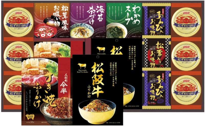 商品内容:人形町今半すき焼きふりかけ30g・松阪牛ふりかけ30g・あわび入お吸い物4g×各2、紅ずわいがにほぐし身55g×6、丸美屋のり茶漬け(6g×2)・永谷園松茸風味お吸い物(2.3g×2)・わかめスープ(3.5g×3)・松茸入りお吸い物4.2g×各1