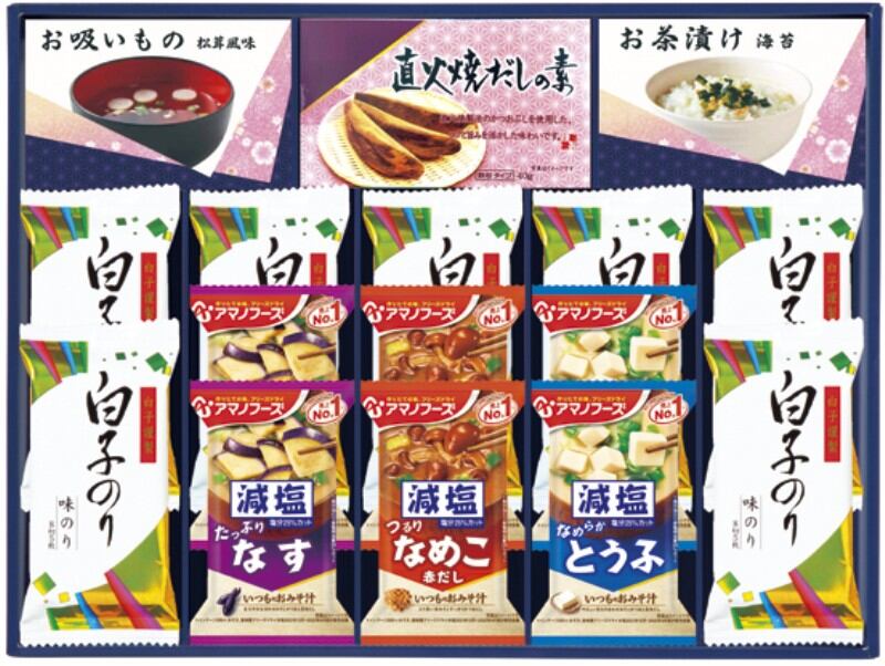 アマノフーズの減塩タイプみそ汁と白子のり味のりを詰合せました。