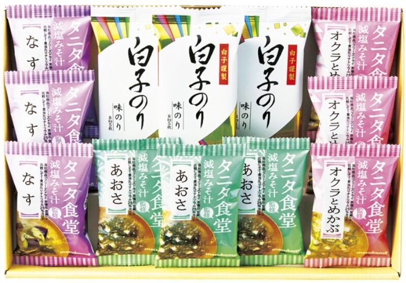 商品内容:タニタ食堂監修減塩みそ汁(あおさ・オクラとめかぶ・なす)・白子のり味のり(8切5枚)×各3