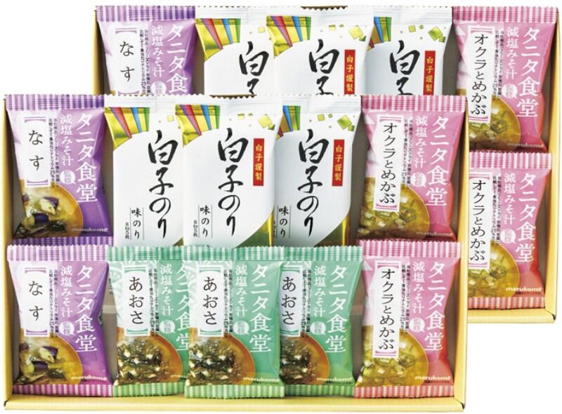 商品内容:タニタ食堂監修減塩みそ汁(あおさ)・白子のり味のり(8切5枚)×各6、タニタ食堂監修減塩みそ汁(オクラとめかぶ・なす)×各4
