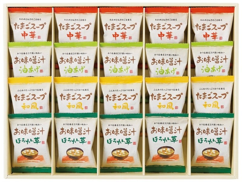 商品内容:お味噌汁(ほうれん草・油あげ)・たまごスープ(和風・中華)×各5