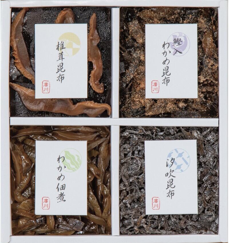 商品内容:椎茸昆布45g・汐吹昆布20g・わかめ佃煮45g・鰹入わかめ昆布50g×各1