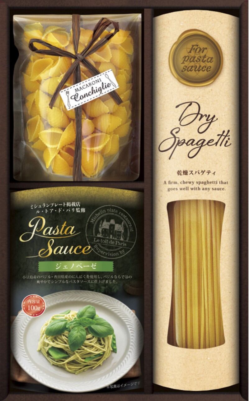 商品内容:スパゲティ130g・マカロニ(コンキリエ)70g・ル・トア・ド・パリ監修あえるパスタソース(ジェノベーゼ)100g×各1