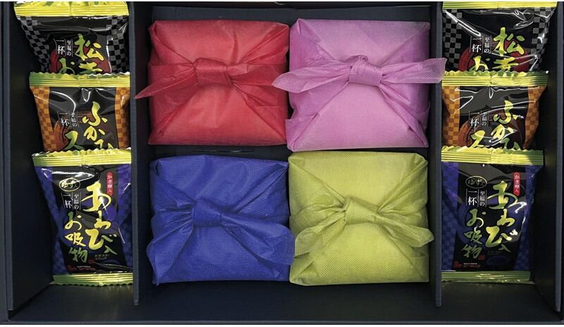 商品内容:新潟県産コシヒカリ150g×3、松茸のお吸物4.2g・ふかひれスープ5.5g・あわび入お吸物4g×各2、笹川流れの塩80g×1