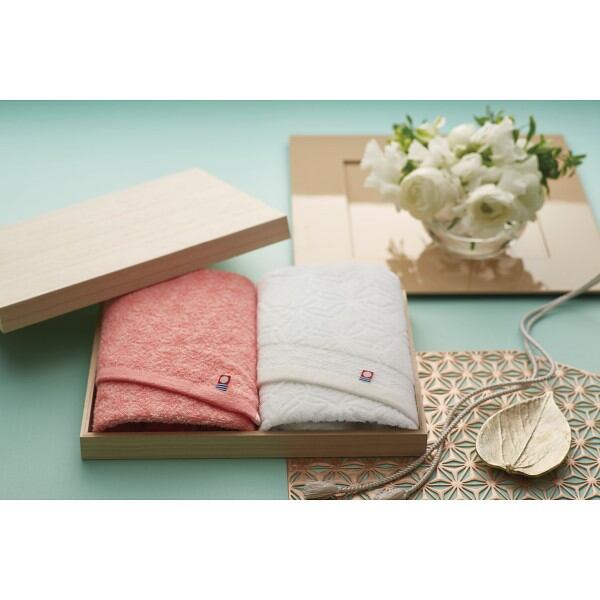 晴れの日を彩る紅白の色彩に成長を願う麻の葉模様を織り上げた、格調高い木箱入りの今治タオル。