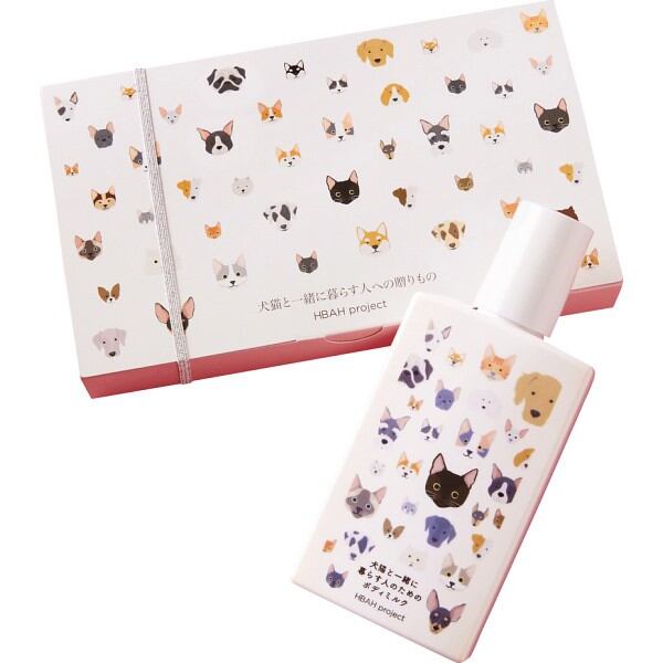 犬猫と一緒に暮らす人のためのボディミルクギフト。キュートな専用ギフトボックスに入っています。犬猫にも飼い主にも優しい成分で作られたボディミルク。犬猫と一緒に暮らす方へのギフトに喜ばれています。天然由来成分100%でボディミルクを塗った肌でも気兼ねなく犬猫と触れ合えます。