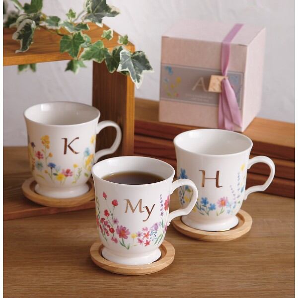 やさしい花々がデザインされた上品な絵柄のマグカップ。