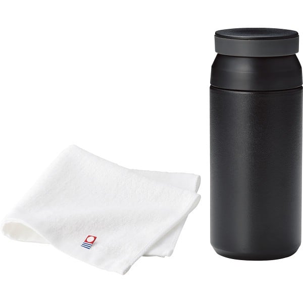 サーモボトルと今治タオルのセットです。ボトルは真空二重構造になっているので飲み頃の温度をキープします