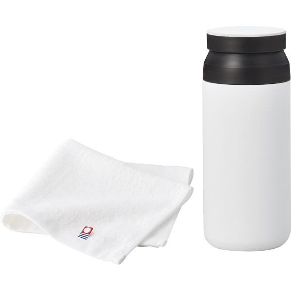 サーモボトルと今治タオルのセットです。ボトルは真空二重構造になっており飲み頃温度をキープします。