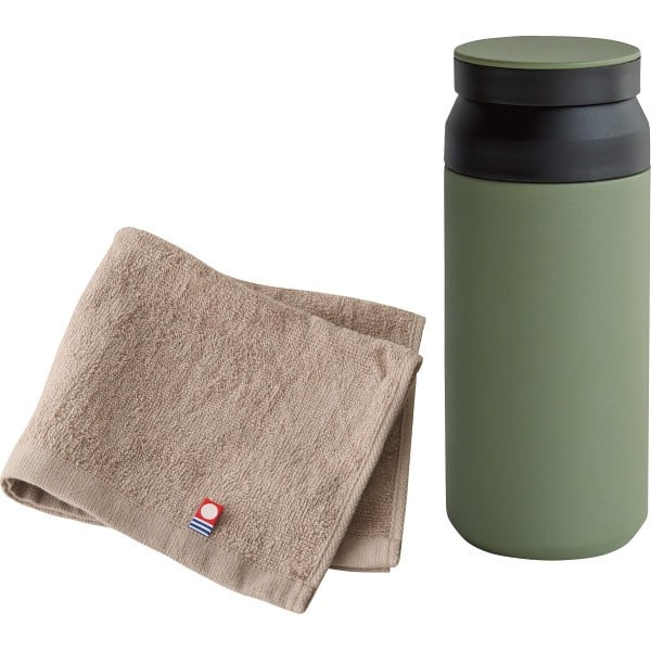 サーモボトルと今治タオルのセットです。ボトルは真空二重構造となっており飲み頃をキープします