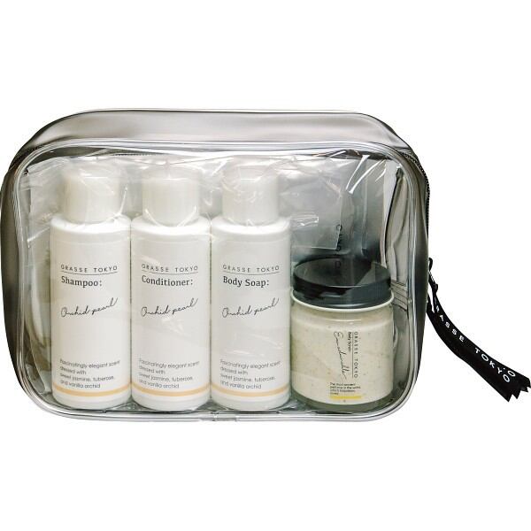 商品内容:●セット内容=シャンプー、コンディショナー、ボディソープ各50ml・ハンド&ボディクリーム3g×2包・エプソムソルト150g(1回分)・ボディスクラブ35g・ポーチ1個※シャンプー、コンディショナー、ボディソープ(香り=オーキッドパール)、ハンド&ボディクリーム(香り=ブラックカラント、ウォーターリリー)は各種共通です。