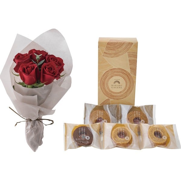 新鮮なバラのブーケと、ふんわりとした食感にしっとり優しい甘さのバームクーヘンのギフトセットです。お部屋を華やかに彩るバラとスイーツのセットは、誕生日、御祝、御礼などにぴったりです。幅広い年齢層に喜んでいただけます。