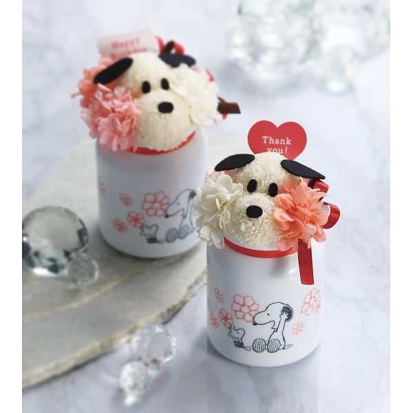 プリザーブドフラワーで作ったスヌーピーが器からちょこんと顔を出しているようなデザインが可愛いアレンジメント。「ありがとう!」の気持ちを伝える「Thank you」ピック付き。感謝の気持ちを伝えるサプライズギフトにぴったりです。