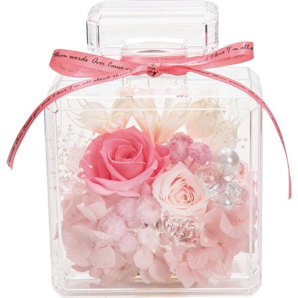 ナチュラルな可憐さを感じさせるオシャレなプリザーブドボトルフラワー。香水瓶をイメージした洗練された花器にスウィートで爽やかなプリザーブドフラワーをアレンジしました。