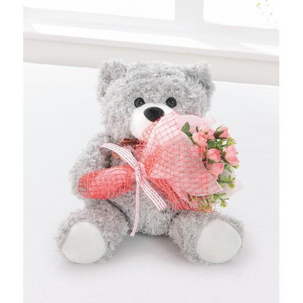 ブーケを抱いたもこもこかわいいクマのぬいぐるみ。可憐なアーティフィシャルフラワーとともに。やさしい気持ちと笑顔もプレゼント。