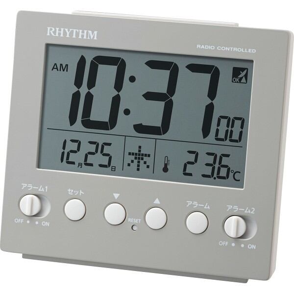 癖のないシックなグレイッシュカラーが特徴、Wアラームつきの電波デジタルめざまし時計です。