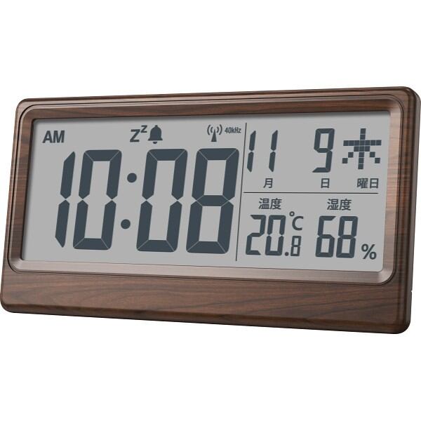 大きな表示の落ち着いた木目調デザイン。室内の環境管理に便利な温湿度表示付き。