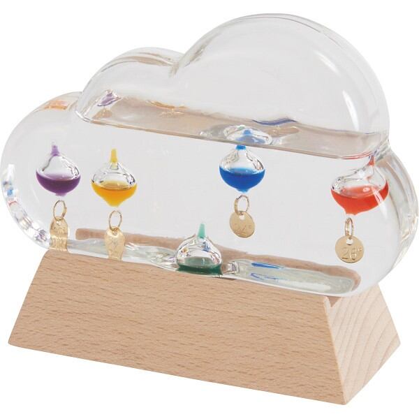クラウド型ガラスの中にカラフルなガラス球が浮かんだ、見た目にも可愛いインテリア温度計です。実際の気温は上層部に浮いているガラス球体の最下段のガラス球体に付いているプレートで読み取ります。
