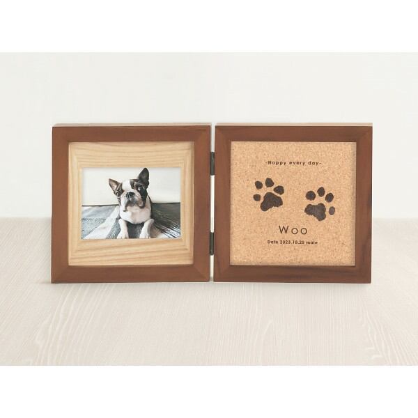 愛犬・愛猫の思い出をナチュラルモダンに飾れるフォトスタンド。かわいい肉球のカタチをコルクボードにオーダーメイドで刻印いたします。「天然木×コルク」を組み合わせた自然素材は、どんなインテリアにもなじむ、上品でやさしいデザイン。折りたたみ式のブックタイプで、飾りやすく収納にも便利なコンパクトサイズです。自然の風合いがやさしく寄り添い、大切な思い出がぬくもりに包み込まれます。