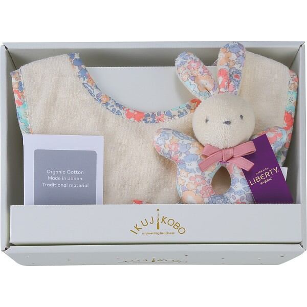 人気のリバティプリントを使用したスタイとラトルのギフトセットです。専用ボックスに入った人気のモデルです。
