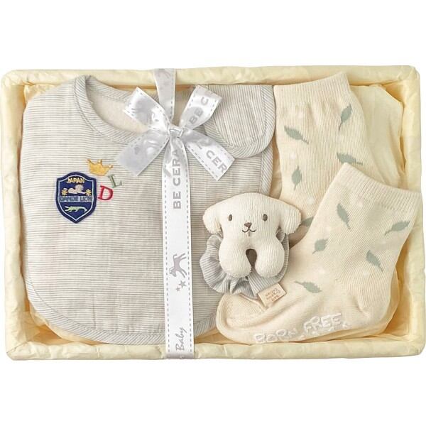 スタイにはワンポイントのアップリケ付き、他にもナチュラルカラーのリストガラガラ・ソックスのセットは、出産お祝いにおすすめです。
