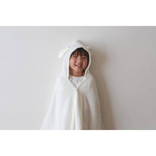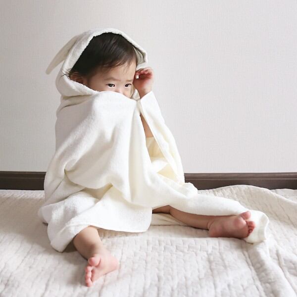 オーガニックコットン100%のやさしい心地のキュートな耳付きバスポンチョ。お風呂上りやおくるみなどにお使いいただけます。