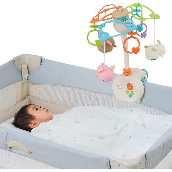 赤ちゃん目線の癒しのメリー。折りたたみ布製ベッド、木製ベッド、フロアでも使用可能です。飾りのどうぶつは印刷ではなくかわいく刺繍で表現しています。15分タイマー付き。