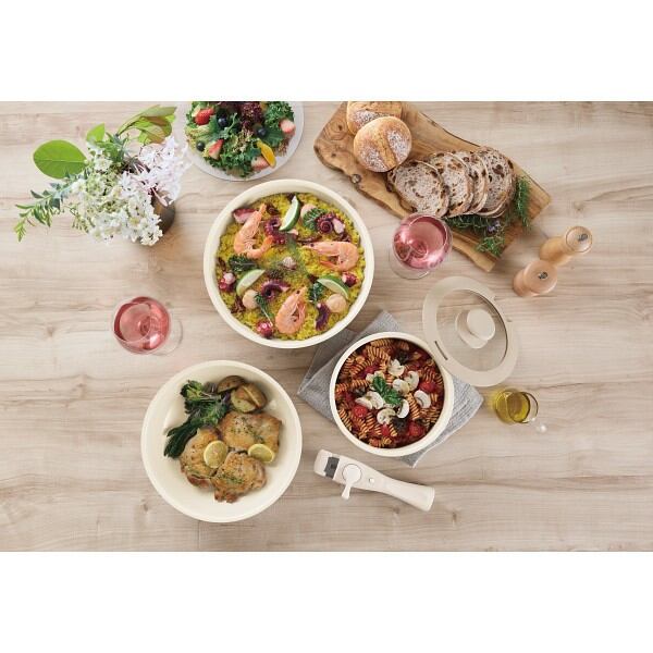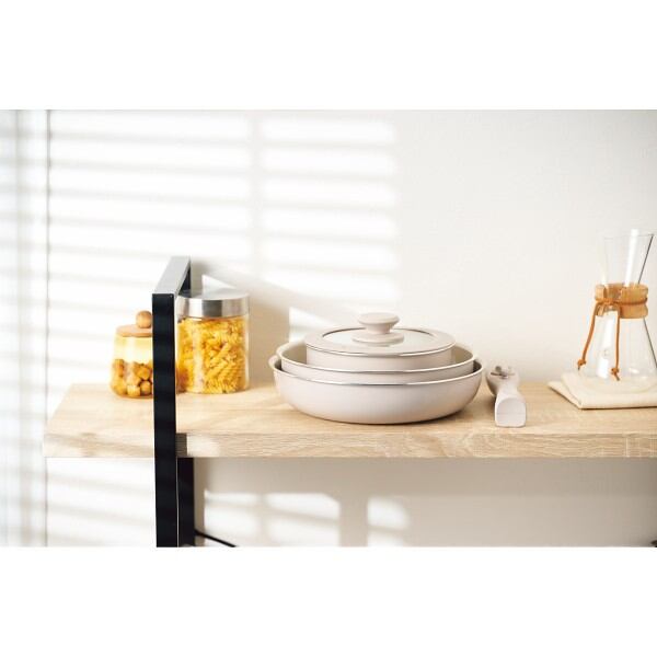 商品材料:●本体=アルミ合金(内面セラミックコーティング加工・外面焼き付け塗装)、底部=ステンレス、ハンドル=フェノール樹脂、蓋=強化ガラス