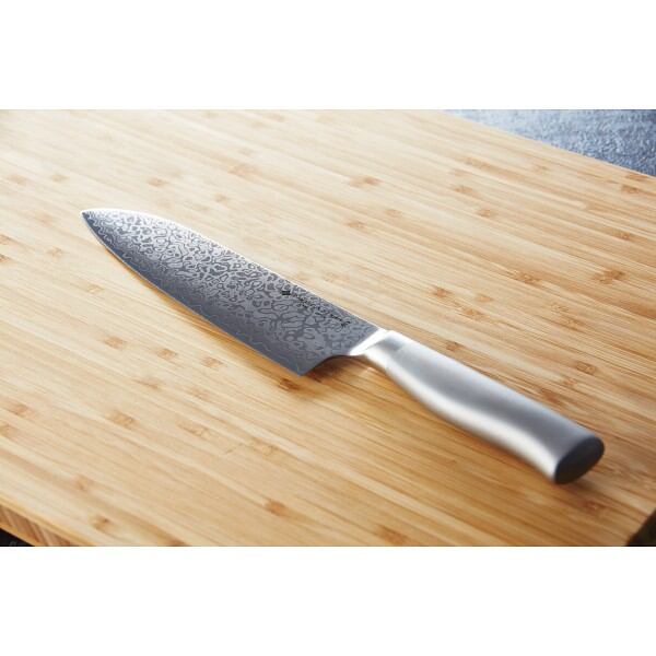 柳宗理のキッチンナイフのデザインはそのままに、刃に高品質なダマスカス鋼を使用した三徳包丁です。多くの工程が職人の手で作られているこだわりの逸品。