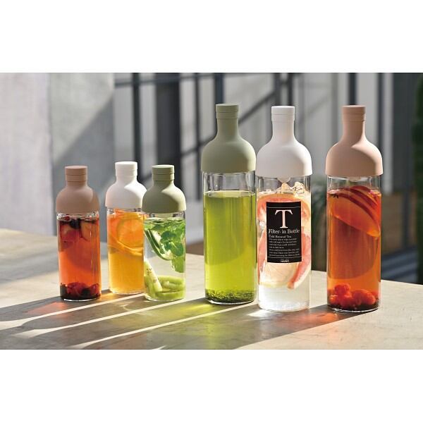 ワインボトル型の水出し茶ボトル。注ぎ口部分にフィルターがセットされているのでそのまま注ぐことができます。