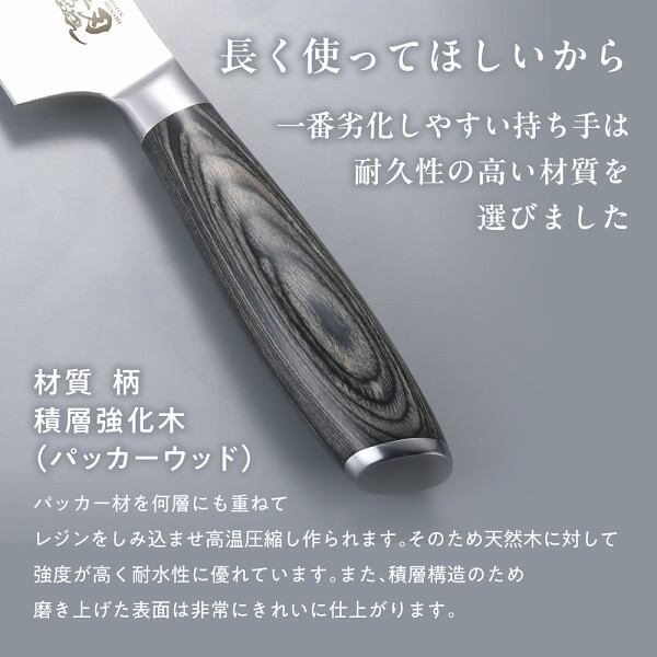長く使ってほしいから一番劣化しやすい持ち手は耐久性の高い材質を選びました。パッカー材を何層にも重ねてレジンをしみ込ませ高温圧縮し作られます。そのため天然木に対して強度が高く耐水性に優れています。また、積層構造のため磨き上げた表面は非常にきれいに仕上がっています。