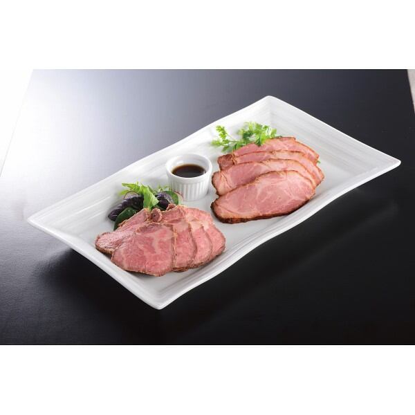 美しいサシとやわらかな食感。 希少部位のトモサンカク使用のローストビーフと、豚肩ロース肉を使用ししっとり仕上げたローストポークのセットです。