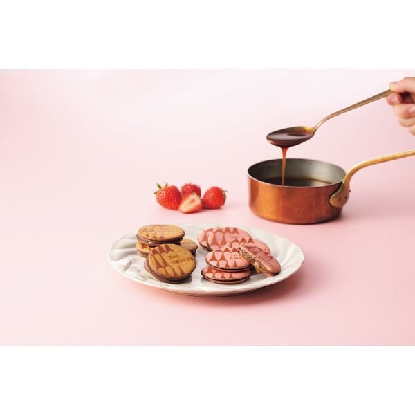 あまおう苺のフリーズドライを混ぜた濃厚なラングドシャ生地でキャラメルとチョコレートをサンドしました。