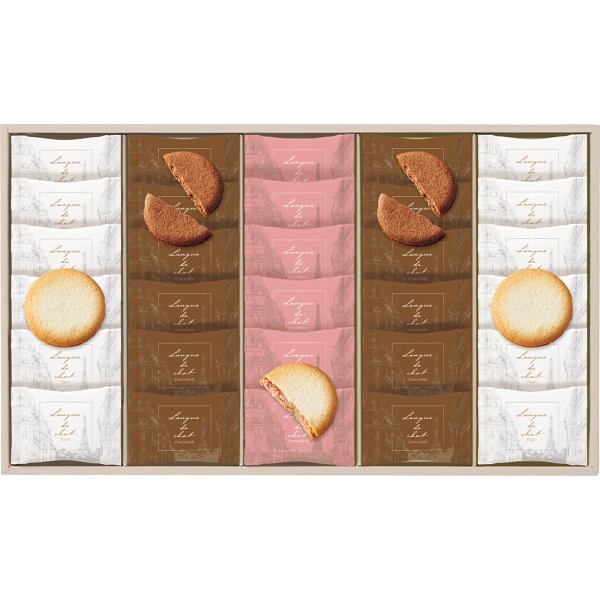 サクサク食感のプレーン生地とココア生地で、ホワイトチョコ、ミルクチョコ、ストロベリーチョコをサンドした3種類のラングドシャの詰め合わせ。