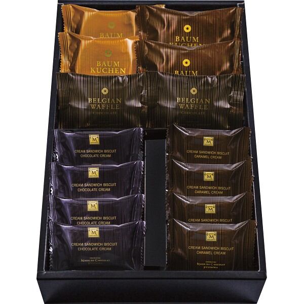 商品内容:●ベルギーワッフル(ショコラ)×2、バームクーヘン(ショコラ・ミルク)×各2、クリームサンドビスケット(ショコラ・キャラメル)×各4