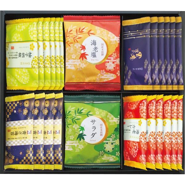 商品内容:●のり巻あられ・柚子胡椒煎餅・海老カレー煎餅×各6、青さ海苔煎餅×4、海老塩煎餅・サラダ煎餅×各3