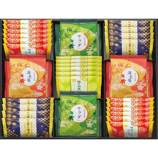 商品内容:●海老カレー煎餅×12、青さ海苔煎餅×8、海老塩煎餅・サラダ煎餅・柚子胡椒煎餅×各6