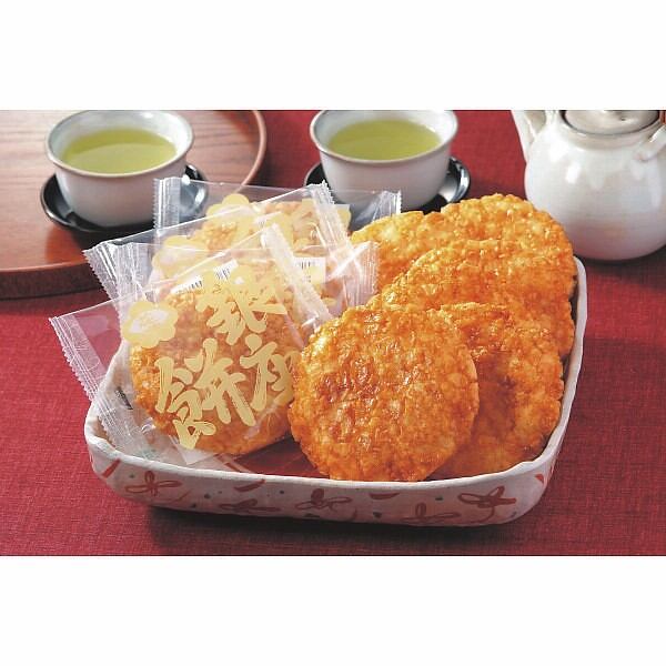 直径約10cmもある国産のうるち米を使用したカラっと揚げたおせんべいを特製醤油タレで仕上げました。上品な味わいでサクッとした口あたりが人気です。