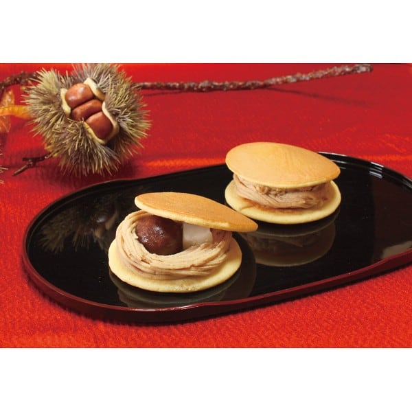 風味豊かでなめらかな口当たりの特製モンブラン餡に渋皮付き一粒栗と求肥餅をのせふんわり焼き上げたどら焼き生地で挟んだ創作スイーツです。