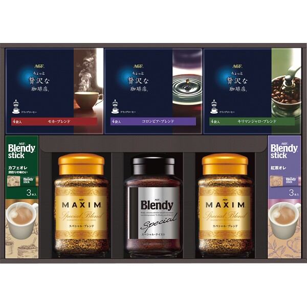 商品内容:●ちょっと贅沢な珈琲店 ドリップコーヒー(モカブレンド・コロンビアブレンド・キリマンジャロブレンド)×各4P、マキシムインスタントコーヒースペシャルブレンド65g×2・ブレンディインスタントコーヒースペシャルテイスト70g×1、ブレンディスティック(カフェオレ・紅茶オレ)各3P×1