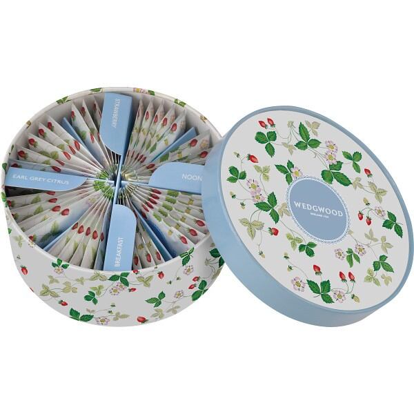 ウェッジウッドの代表パターン「ワイルド ストロベリー」の円柱パッケージに入った4種類のアソートティーバッグ。その日の気分に合わせて楽しめます。