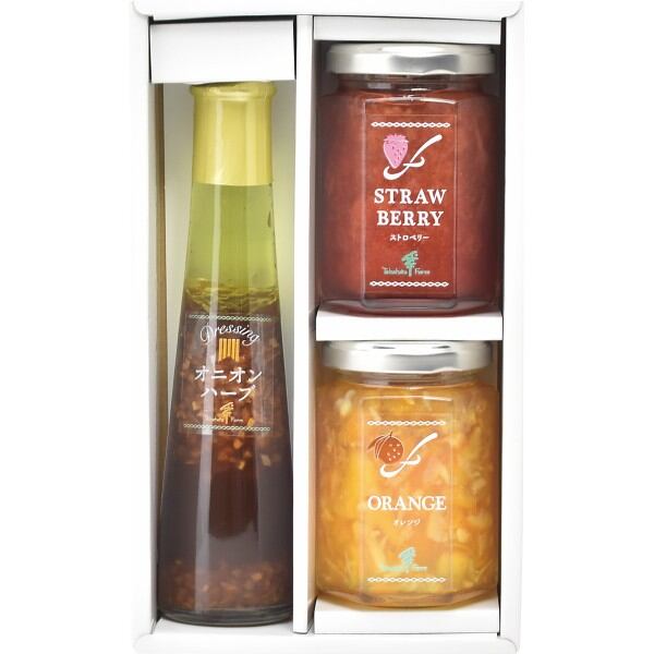 商品内容:●ジャム(ストロベリー・オレンジマーマレード)各145g×1、ドレッシング(オニオンハーブ)122ml×1