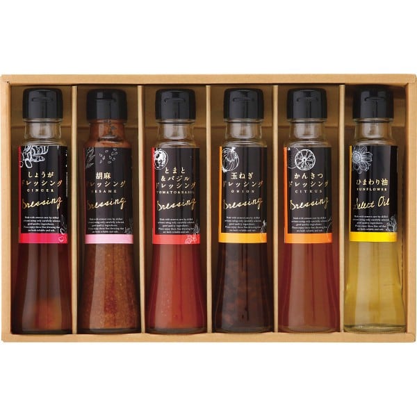 商品内容:●しょうがドレッシング・胡麻ドレッシング・とまと&バジルドレッシング・玉ねぎドレッシング・かんきつドレッシング各100ml×各1、ひまわり油90g×1