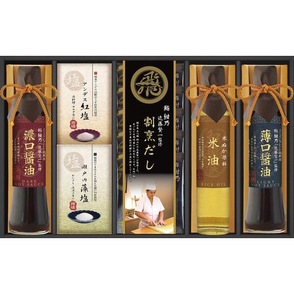 商品内容:●鮨 紺乃監修 あご入リ割烹だしパック8g×5、鮨 紺乃監修 飛騨高山濃口醤油200ml・鮨 紺乃監修 飛騨高山薄口醤油200ml・アンデス紅塩50g・瀬戸内藻塩50g・米油165g×各1